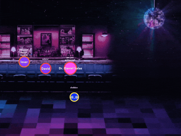 As the players enter the ‘bar scene’, their choice of movement will shoot off an automated social commentary. If they huddle around in a big group the social commentary might say ‘original aren’t you?’ Or “bunch of sheep’, if you’re by yourself it might say ‘i’m a cat person anyway’ or ‘leave me alone’. If you are in a couple it might say ‘fancy a drink?’, in a group of 3 it may say ‘fancy a threesome?’.